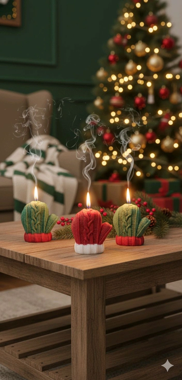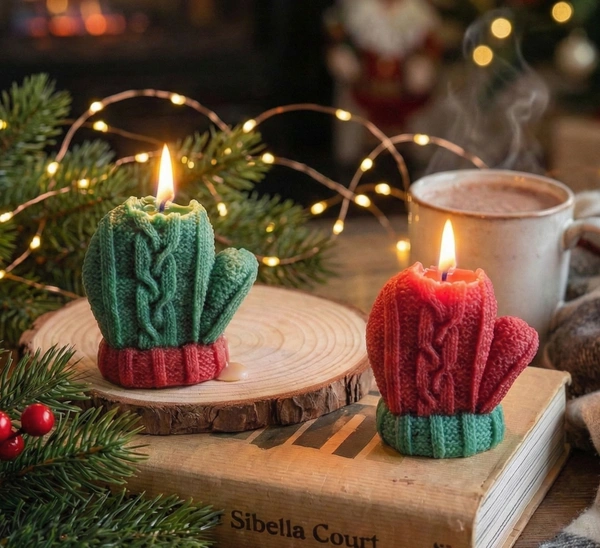 Cozy knitted mitten candles cast a festive glow, warming the heart and home with their charming presence.