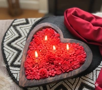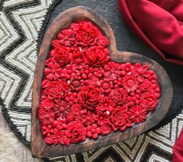 A beautifully handcrafted candle featuring intricate red floral wax designs set on a 5-inch wooden heart-shaped base. Elegant, aesthetic, and perfect for gifting or home décor.